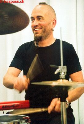 Die zweite Übung, die ihr übrigens mit der Tabulatur oben selbst nachspielen könnt, sofern euch ein paar Noten nicht ins Bockshorn jagen und ihr ein Drum zu Hause habt. Monthy gibt sich und hat Mühe, wobei dies für Schlagzeug-Anfänger nicht ungewöhnlich ist. Tom ist jedenfalls nicht unzufrieden, ermahnt mich hie und da zu mehr Tempo oder gibt mir nützliche Tips. Beispielsweise, dass ich mit dem Hi-Hat-Fuss immer ganz unten bleiben soll, um nur ganz kurz los zu lassen, wenn ich den Schlag initiiere. Das ist - in Kombination mit all den anderen neuen Dingen - gar nicht so einfach... "Alles was du am Set machst - locker machen... ´Du metzgisch di guet´".
