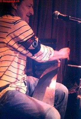 Ich mag mich an einen Gig von Ochsners erinnern, als plötzlich das gesamte eigene Set umgeschrieben worden war. Les Trois Suisses sind auch eher spontan und dass Adi Weyermann mit seinen Gästen nicht gross proben kann, fordert deren Flexibilität. Ich frage Resli, ob ihm Improvisation schon immer nahe gewesen sei? - "Improvisation wäre ein bisschen viel gesagt, die Formen sind doch relativ klar. Ich bewege mich immer in einfacher Musik und man spricht das Arrangement ja schon ab. Manchmal ergibt sich überraschend etwas und wenn man ´gschpürig´ genug ist, kann man darauf einsteigen. Solche Sachen sind immer interessant, aber ich würde es noch nicht als Improvisation bezeichnen. Jedenfalls nicht total frei, sondern eben in Formen, die ich ganz gerne mag." Adi nimmt den Faden gleich auf und erklärt mir anhand des konkreten Beispiels, was in der Vorbereitung auf ein Montagslokal so läuft: "Wir hatten uns insofern abgesprochen, dass ich ihm eine CD geschickt hatte und Cords hatten wir aufgeschrieben. Aber wo wir dann genau hingehen? Was ich im Zusammenspiel mit immer neuen Leuten gemerkt habe, ist dass ein Song, beim ersten kompletten Durchspiel eine besondere Magie hat, auch wenn er noch voller Fehler ist. Bis dieses gewisse Etwas dann wiederkommt, braucht es fünf-, sechs-, vielleicht sogar achtmaliges Wiederholen. Das erhoffe ich mir jeweils von diesen Montagskonzerten und es hat heute auch wunderbar gespielt."